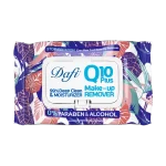 دستمال مرطوب پاک کننده آرایش دافی مدل Q10 یکی از این محصولات است که بدون نیاز به آب و صابون پوست را از هرگونه آرایش ضد آب پاک کرده و حاوی عصاره گل های بهاری و آنزیم Q10 است که التهاب، قرمزی و حساسیت پوستی را رفع میکند. بدون الکل و پارابن است که به پوست آسیبی نمیرساند و فاقد صابون است که نیازی به شستشو با آب ندارد. این محصول به دلیل دارا بودن عصاره شکوفه های گیلاس ژاپنی و فلاونوئید یک آنتی اکسیدان قوی است که از ایجاد جوش و آکنه جلوگیری میکند. از این دستمال به عنوان آبرسان و مرطوب کننده نیز میتوان استفاده کرد. در هر بسته بندی از این محصول 50 عدد قرار گرفته است و درب روی این دستمال از خشک شدن آن جلوگیری میکند.