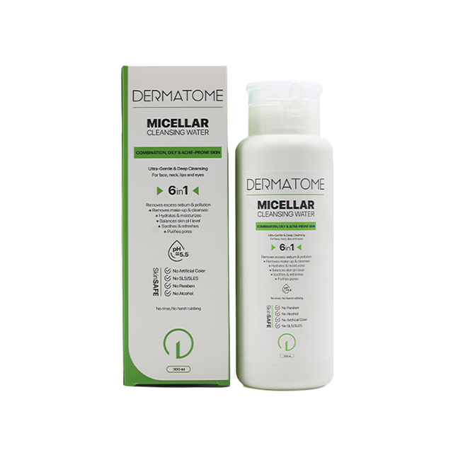 میسلار واتر پوست چرب درماتوم، با در اختیار داشتن فرمولاسیون اختصاصی آلودگی های پوست را به سادگی و ملایمت پاک می نماید. این محصول می توان برای پاک کردن آرایش نیز مورد استفاده قرار گیرد. استفاده از این محصول موجب تسکین و آرامش بخشیدن به پوست می شود و رطوبت رسانی را به صورت عمیق برای پوست انجام می دهد. n n ترکیباتn فنوکسی اتانول، اتیل هگزیل گلیسرین، ویتامین B5، عصاره کالاندولا، بوتیلن گلایکول، عصاره انانتیا کلرانتا، اولئانولیک اسید، عصاره بابونه و …n n هشدارn در صورت ایجاد هرگونه حساسیت مصرف این محصول را قطع کنید. n از تماس این محصول با چشم، زخم باز و نواحی مخاطی خودداری شود.n n طریقه نگهداریn در جای خشک و خنک زیر 30 درجه سانتیگراد و دور از تابش نور خورشید نگهداری شود.n n طریقه مصرفn مقداری از این محصول را بر روی پنبه و یا پد آرایشی قرار دهید سپس به آرامی بر روی صورت کشیده تا آلودگی و مواد آرایشی را از روی پوست پاک کند.